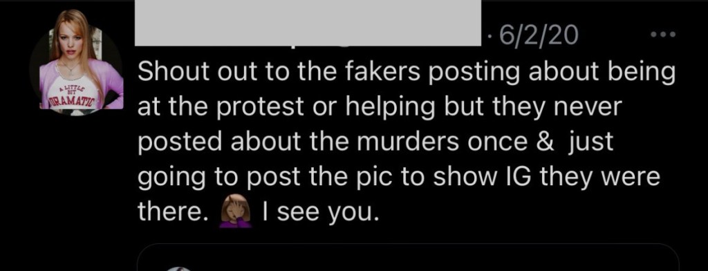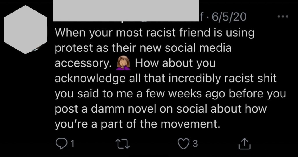Suddenly I’d become her most racist friend. A faker. I was using social media to absolve my white guilt and posting novels. I mean, yes I am verbose. I will own that. However, this feels loaded. I will say I received hundreds of comments on these posts, all of them thanking me for sharing my perspective from the front line, aka my home.