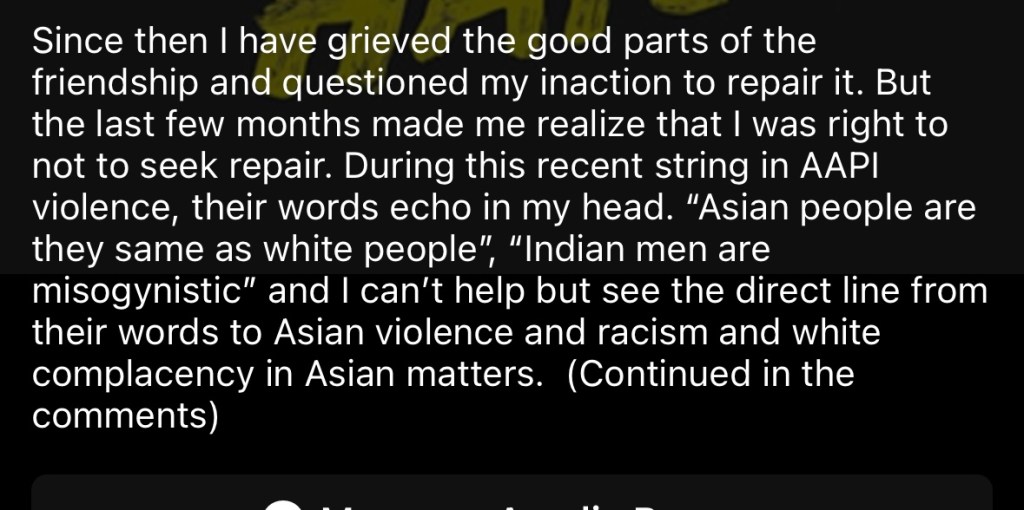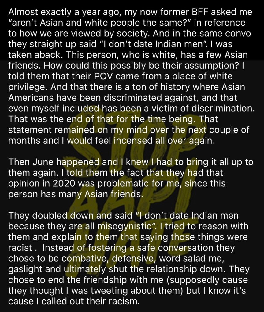 Again, with the claim that not wishing to be romantically involved with someone with a culture or religion I don’t align with is racist. Again, Desi is not a race. Again, dating preferences are not racism. Again, this person has zero clue about dating in the Seattle tech scene.